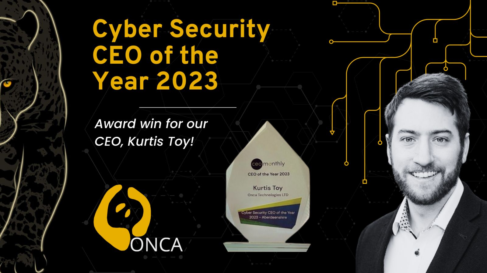 Kurtis Toy, Chief Executive of Onca Technologies Ltd, has been awarded the 2023 award for Cyber Security CEO of the Year – Aberdeenshire from CEO Monthly.