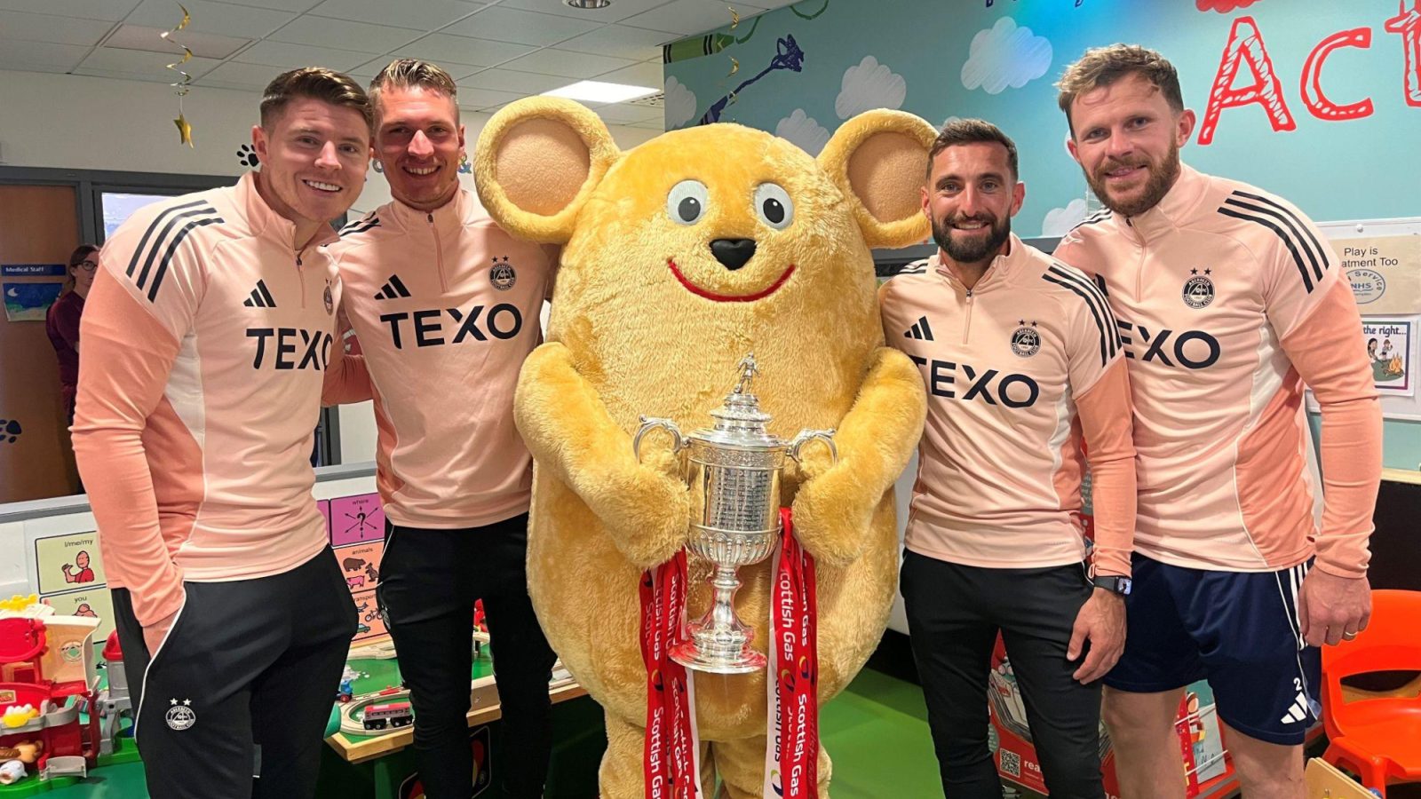 Young patients at Royal Aberdeen Children’s Hospital got up close with the Scottish Cup yesterday, when their Dons heroes visited the wards to show off the historic silverware.