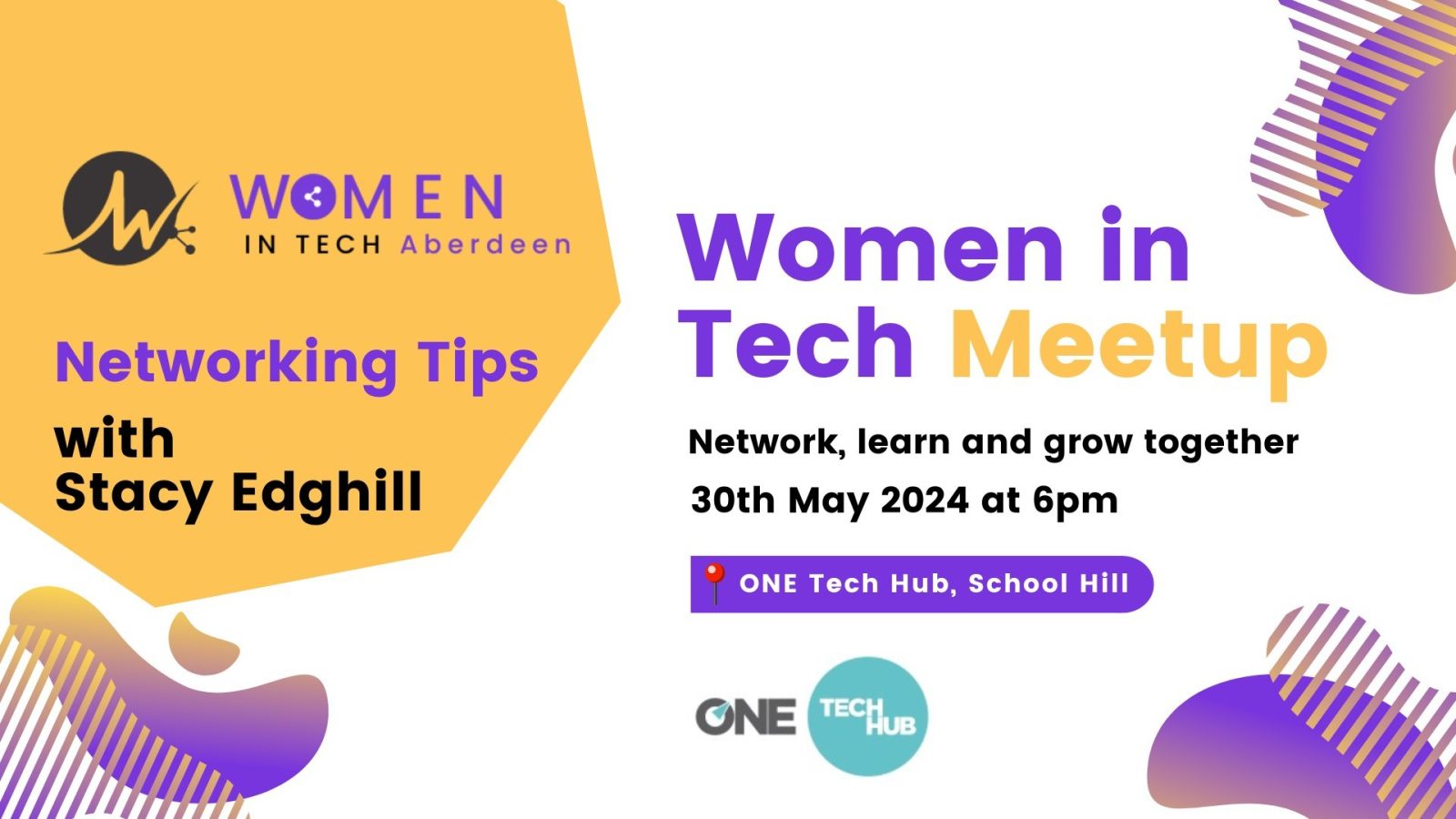 The event will take place at the One Tech Hub, commencing at 6:00pm and will be facilitated by Stacy Edghill, Founder and Managing Director of Hibiscus Media. A special guest, Silka Patel from Scotland Women in Technology will also join and share details about the work they do across Scotland and provide an update on this year’s Women in Tech Awards, including nomination tips.
