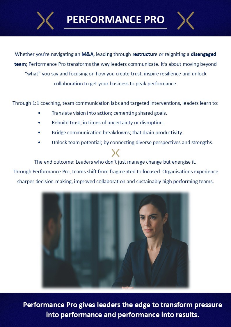 Whether you’re navigating an M&A, leading through restructure or reigniting a disengaged team; Performance Pro transforms the way leaders communicate. It’s about moving beyond “what” you say and focusing on how you create trust, inspire resilience and unlock collaboration to get your business to peak performance.