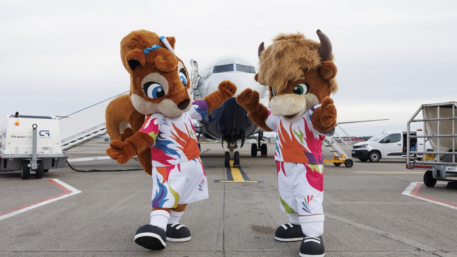 The dynamic duo, Dee the Red Squirrel and Ref Don the Highland Bull, took centre stage on Friday (December 12th) as they ‘stepped off’ a plane from London at Aberdeen International Airport and landed to a warm Granite City welcome.