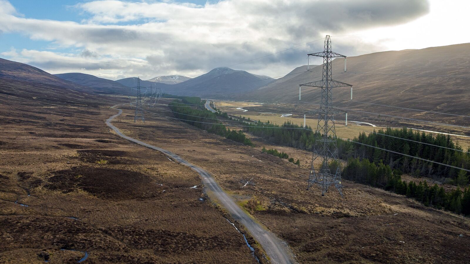 Transmission towers from the Beauly to Denny overhead line, comparable to the infrastructure proposed for the Beauly to Peterhead project.