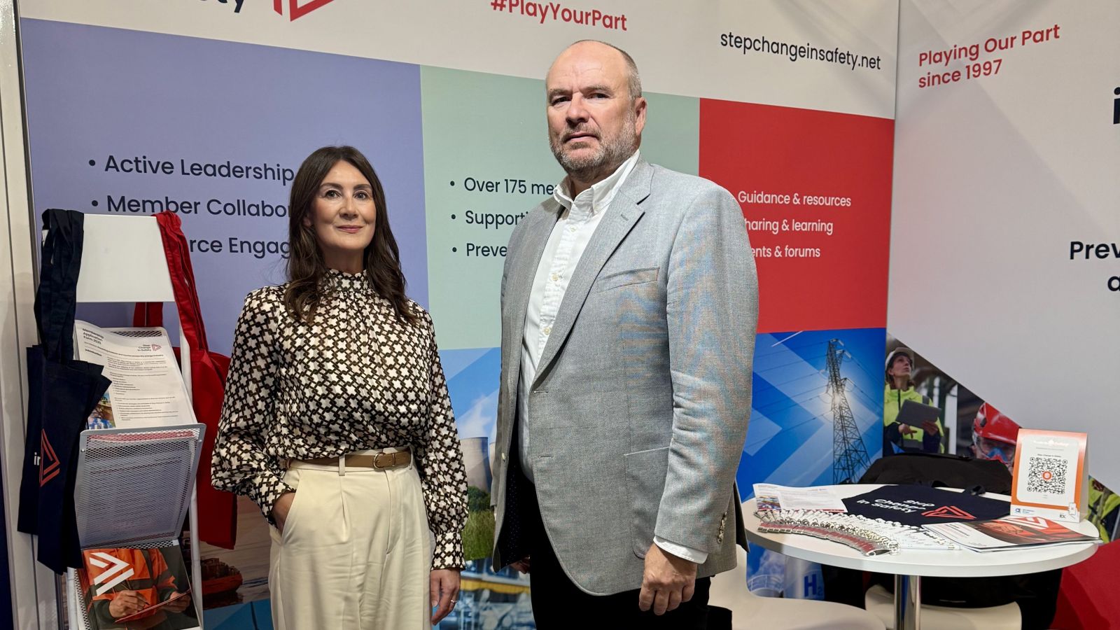 Nicola Taylor, Business Engagement Manager, and Craig Wiggins, CEO, unveiling the new Step Change in Safety brand on day one of SPE Offshore Europe 2025.