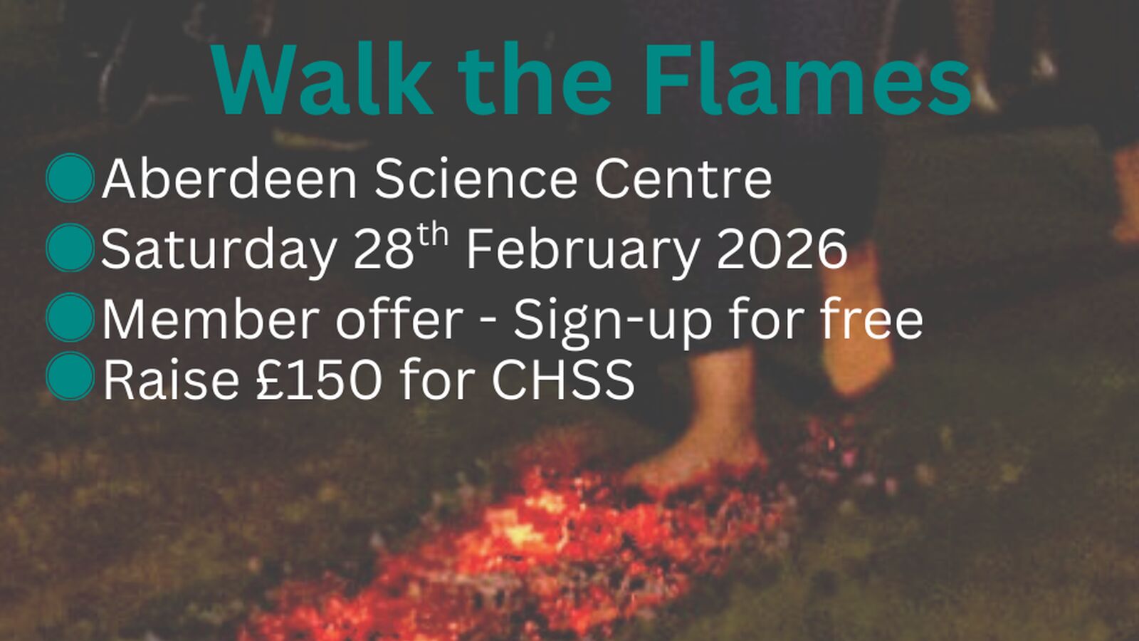 Challenge your colleagues, boost morale, and support Chest Heart & Stroke Scotland by taking part in the Aberdeen Firewalk at Aberdeen Science Centre on Saturday 28th February 2026.