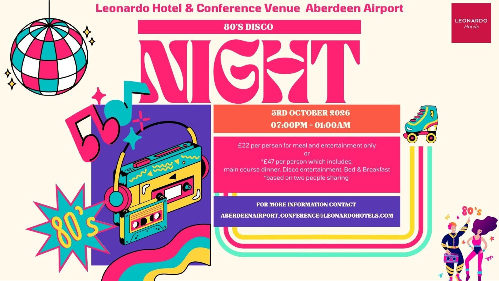To reserve a place, please email Aberdeenairport_Conference@leonardohotels.com or call 01224 793 201 (option 3) between 9:00am and 5:00pm, Monday to Friday.